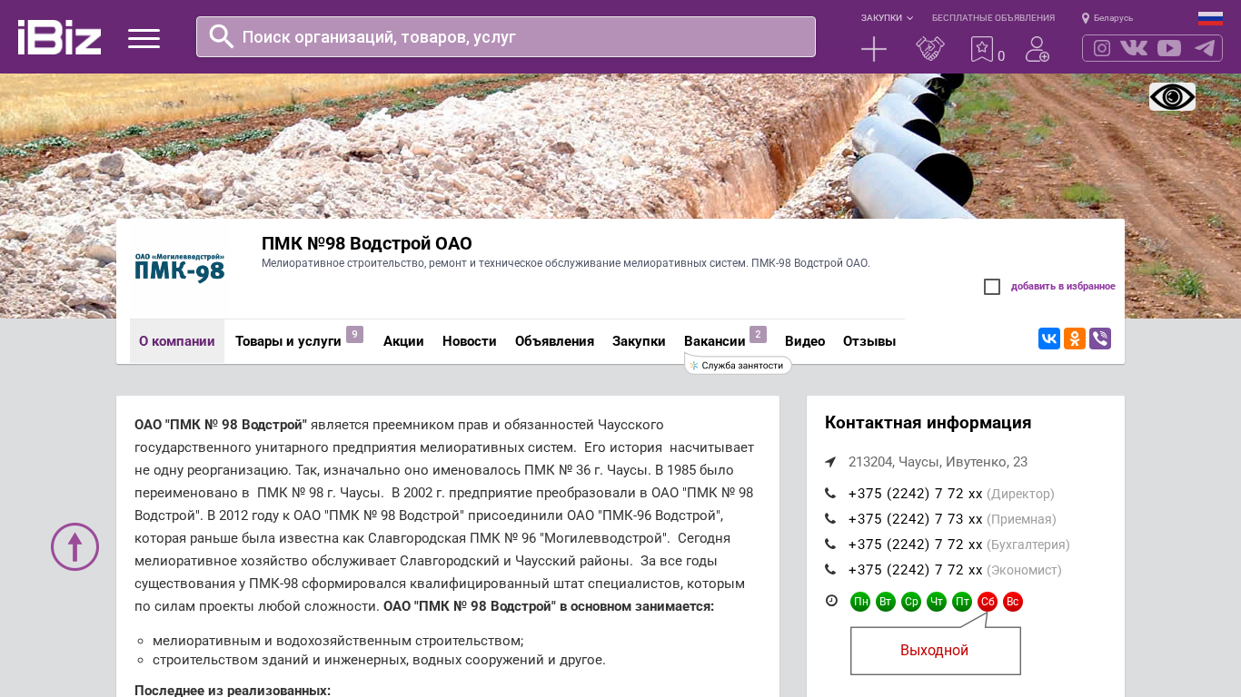 favicon ПМК №98 Водстрой ОАО - Мелиоративное строительство, ремонт и техническое обслуживание мелиоративных систем. ПМК-98 Водстрой ОАО.. 213204, Чаусы, , Ивутенко, 23