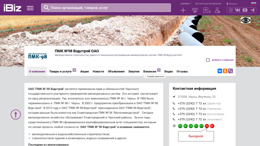 The web project "ПМК №98 Водстрой ОАО" is a company specializing in meliorative construction, repair, and technical maintenance of meliorative systems. The company is located in Chauny, Belarus, with the address 213204, Ivuthenko, 23. It is a successor to the former state enterprise for meliorative systems in Chauny, and has undergone several name and organizational changes throughout its history. Originally named PPK #36 g. Chauny, it was later renamed PPK #98 g. Chauny in 1985 and reorganized into OAO "ПМК № 98 Водстрой" in 2002. In 2012, OAO "ПМК № 98 Водстро