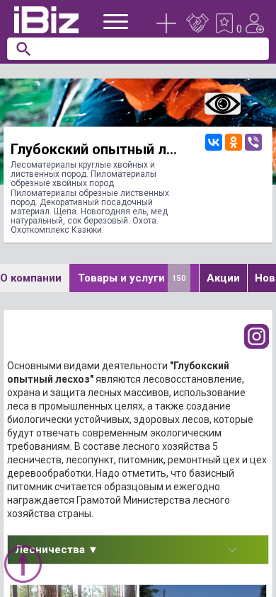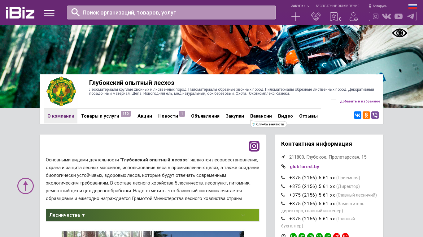 | Название / Заголовок | Глубокский опытный лесхоз - Лесоматериалы круглые хвойных и лиственных пород. Пиломатериалы обрезные хвойных пород. Пиломатериалы обрезные лиственных пород. Декоративный посадочный материал. Щепа. Новогодняя ель, мед натуральный, сок березовый. Охота. Охоткомплекс Казюки.. 211800, Глубокое, , Пролетарская, 15 |