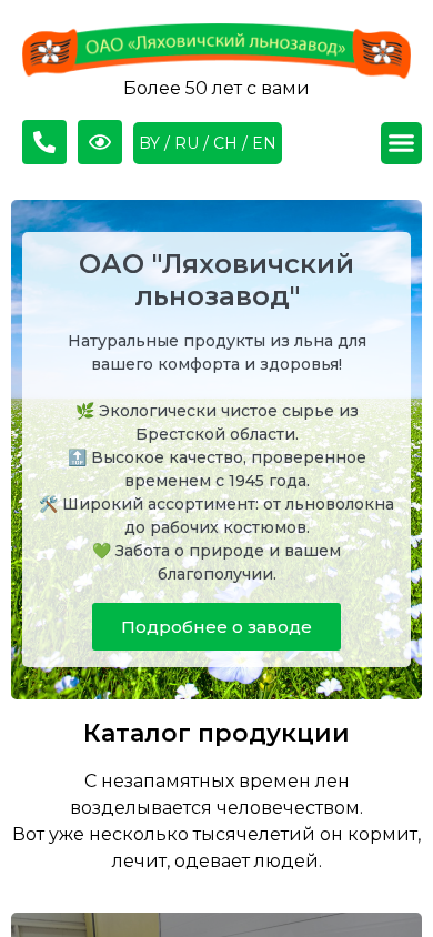 | AI-анализ | This online resource belongs to the official website of "Ляховичский льнозвод" OAO (Liahochitsky Linen Mill), located in Belarus, Brest Oblast, Liahochitsky District, Olkhovsky Rural Council, village of Olkhovka, near the village of Zadvorye. The website provides information about the company's history, management, departments, vacancies, catalog of products, useful information, anti-corruption policy, data protection policy, citizen and legal entity appeals, administrative procedures, and trade union activities for shareholders. The website offers natural linen products for comfort and health from eco-friendly raw materials in Brest Oblast. The high-quality products have been proven since 1945. A wide range of items is available from flax fiber to work uniforms. The website is |