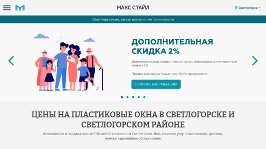 | AI-анализ | The web project "Okna PVH in Svetlogorske from the manufacturer - Max Style" offers PVH windows in Svetlogorske and the surrounding area for production and sale. With 18 years of successful operations and thousands of satisfied clients, Max Style Svetlogorsk specializes in the manufacture and sale of various complex PVH windows. The website provides information on the company's windows, production process, and contact details. Currently, the Svetlogorsk office is moving and temporarily not accepting orders. From November 26 to 30, there is a 40% discount on all PVH windows in Svetlogorske. From February 1 to March 15, there are additional discounts of up to 35% on certain window types. The site also features information on their collaboration with Brusbox, offering modern window systems, a |