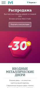 | AI-анализ | --- The web project "Входные металлические двери в Борисове - Макс Стайл" offers metallic doors in Borisove at low prices. They provide doors of any protection class in Borisove. Max Styl Borisov has been successful for 12 years and has thousands of satisfied clients. The website also sells PVC windows, transformer furniture, and interroom doors. The catalog includes sections for standard, standard+, and elit series. The regions served are Minsk, Bobruisk, Borisove, and others. There are special offers such as a three-day sale with a 15% discount, a week of big discounts with a 20% discount, and a sale of entry doors with a 30% discount. There is also a sale of PVC windows with a 30% discount. The website offers consultations |