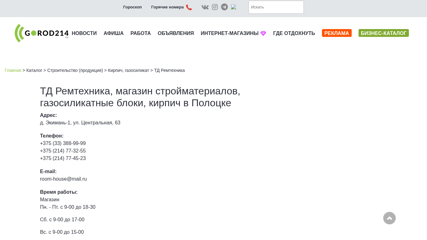 | SEO-описание | ТД Ремтехника, магазин стройматериалов, газосиликатные блоки, кирпич в Полоцке |