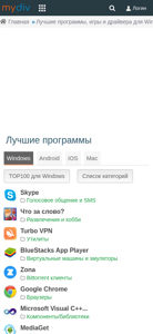 This website provides a list of the best software, games, drivers, and applications with 100% free download options for Windows, Android, iOS, and MacOS. It includes news, articles, reviews, and opinions on various programs, games, and drivers. The main sections include Newest, All, Windows, Android, iOS, MacOS, Top100, Skype, Utilities, BlueStacks App Player, Virtual Machines and Emulators, Zona Bittorrent clients, Google Chrome browsers, Microsoft Visual C++ components, and MediaGet Bittorrent clients. The domain also offers information on DriverPack Solution, ProtonVPN, Tinkercad, SAPR MAX, Messengers, Radmin Viewer, and Windows Live (Windows Live Movie Maker). The website provides lists of categories for TOP100 programs for different operating systems and various popular program bundles