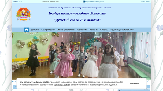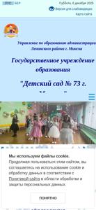 | AI-анализ | This website is for the State Educational Institution "Children's Garden No. 73" located in the Leninsky District of Minsk, Belarus. The title and description indicate that it is a kindergarten. The keywords include "education," "institution," "pedagogues," and "help." The top_words list shows that the website contains information about the schedule for receiving citizens, administrative procedures, electronic application, and contacts. The website uses cookies and has a link to its privacy policy. The size and line spacing of the text can be adjusted, and there is a map of the site. The website includes information about the administration, admission procedures, policies on data processing and video surveillance, and contacts for various departments and officials. There are also sections for staff, a FAQ, vacancies, and a photo album. The website is available in both Russian and Belarusian. |