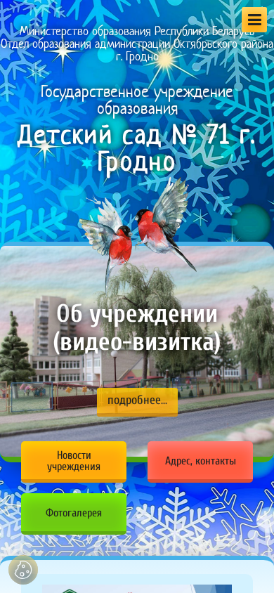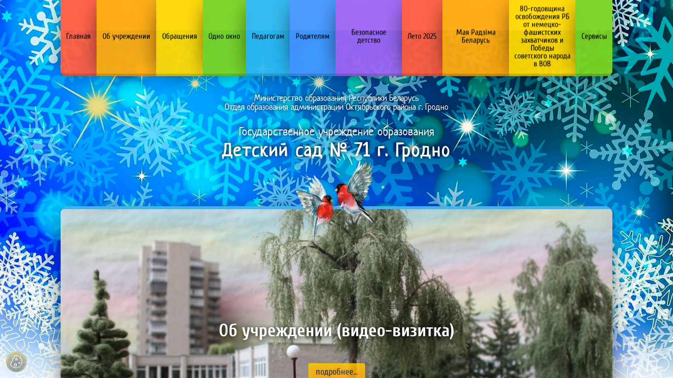 | AI-анализ | --- This online resource is dedicated to the Kindergarten No. 71 in Grodno, Belarus. The title of the website reflects its official name and its structure includes information about the institution's leadership, administration, address, contacts, working hours, collective, psychological services, licensing, charter, important documents, and various announcements. The website also features a photo gallery, a section for submitting inquiries, and contact information for various services and hotlines. Additionally, it provides a list of nearby organizations offering psychological, psychiatric, and therapeutic help, as well as links to higher-level government agencies and relevant regulatory documents. The website is operated by the Kindergarten No. 71 in Grodno, and it includes sections on administrative procedures, pedagogical guidelines, and the rights and responsibilities of stakeholders. The website also offers information on enrolling in kindergarten |