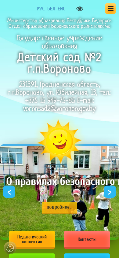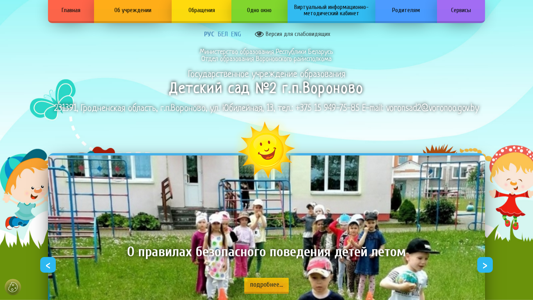 | AI-анализ | The portal sad2.voronoo.gov.by is a website for the Kindergarten No. 2 in the town of Voronovo. The site provides comprehensive information about the kindergarten, including its leadership, schedule, tasks and functions, licensing, and structure. Visitors can learn about the history, traditions, and achievements of the kindergarten, as well as view a video presentation, photo project, and news sections. The site also offers information about the pedagogical team, veteran teachers, and contacts for employment opportunities. Users can access various documents, including normative legal and educational materials, and find information about administrative procedures and parents' rights. The site includes a virtual informational and methodological cabinet for supporting educational processes, as well as interactive features for parents and a map of available spaces in kindergartens in the Grodno region. The keywords associated with the site include education, institutions, Vor |