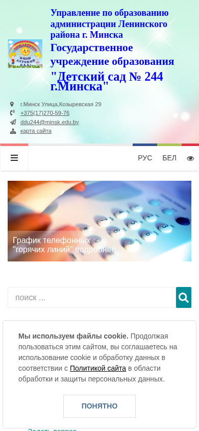 | Адрес | Ленинского района г. Минска, Государственное учреждение образования, "Детский сад № 244 г. Минска", г. Минск Улица,Козыревская 29 |