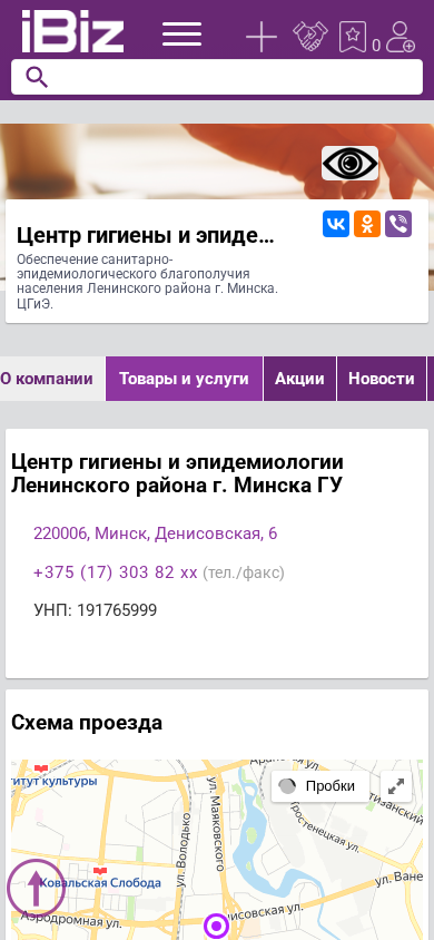 | AI-анализ | This website belongs to the Center for Hygiene and Epidemiology of Leninsky District, City of Minsk, a governmental body responsible for ensuring the sanitary-epidemiological well-being of the population in Leninsky District, Minsk. The organization's address is at 220006, Denisovskaya Street, 6 in Minsk. The website provides contact information, including a phone number and a fax number. The company operates from Monday to Friday, 8:00 AM to 7:00 PM, without lunch breaks. The website includes sections for company information, products and services, news, announcements, vacancies, videos, and customer reviews. It also has a map and information on how to get there. The organization is categorized under 'Sanepidemstanции' and 'Sanepidemstanции в Мин |