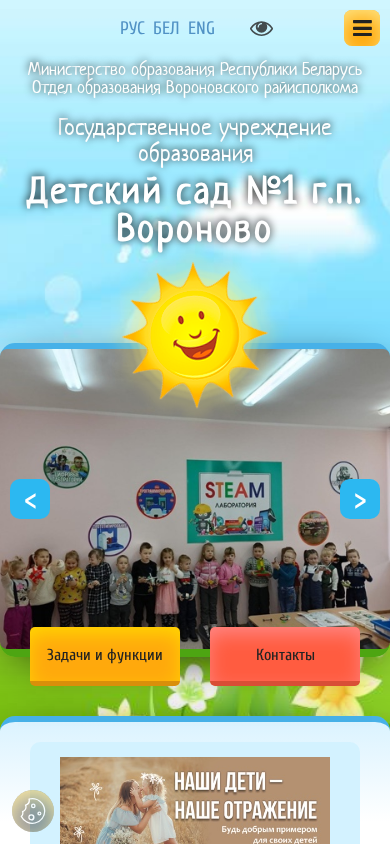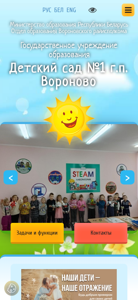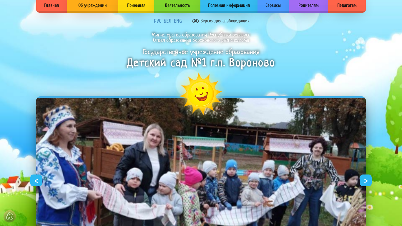 | AI-анализ | --- The web project "Детский сад №1 г.п. Вороново" (Sad1.voronoo.gov.by) is a site for a kindergarten in the town of Voronovo. Key topics include education, kindergarten, Voronovo, and schedule. The site provides information on the kindergarten's structure, working hours, schedules for specialized staff, tasks and functions of the management, and contacts for various authorities. The site also includes a rating evaluation portal, a policy on personal data processing, licensing information, and the kindergarten's history, traditions, and achievements. Services offered include healthcare, specialized services for children with disabilities, group integration, and educational programs. The site also has sections on state symbols, variable forms of preschool education, and anti-corruption activities. The kindergarten offers a "Day of Birth with |