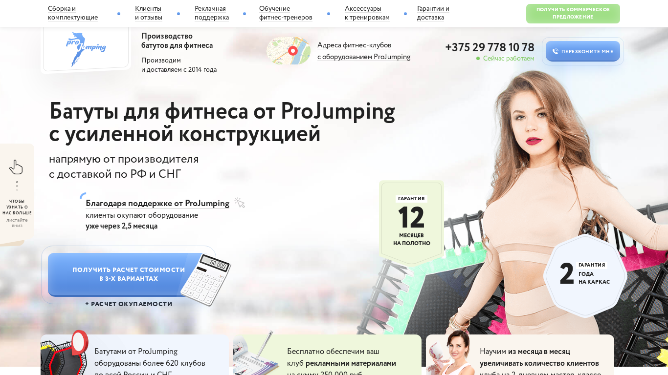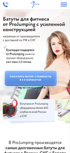 | AI-анализ | This website, titled "ProJumping," is a business dedicated to the production and sales of fitness trampolines, or "батуты," in Belarus and the CIS. Keywords include "ProJumping," "батутов," "расчет," "батуты," "более," "при," "получите," "стоимости," "окупаемости," "получить," "батута," "3-х," "вариантов," "следующий," "все," "скидку," "фитнеса," "срок," "фитнес-клуб," and "СНГ." The website offers production and delivery of fitness trampolines since 2014, with addresses of fitness clubs equipped with ProJumping trampolines provided. |