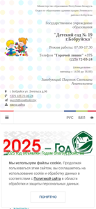 | AI-анализ | The web project "Детский сад № 19 г.Бобруйска" (Children's School No. 19 in the city of Bobruisk) is a government educational institution under the Ministry of Education of the Republic of Belarus, administered by the Education Department of the Leninsky District of Bobruisk city. The website provides information about the kindergarten's schedule, administration contacts, and admission procedures. Visitors can find details about the kindergarten's management team, contact information, and a map of the location. The site also includes sections on administrative processes, handling citizen inquiries, and emergency assistance for the disabled. The kindergarten's operating hours are from 7:00 AM to 5:30 PM, with a dedicated phone line for inquiries available from Monday to Friday between 2:00 PM and 4:0 |