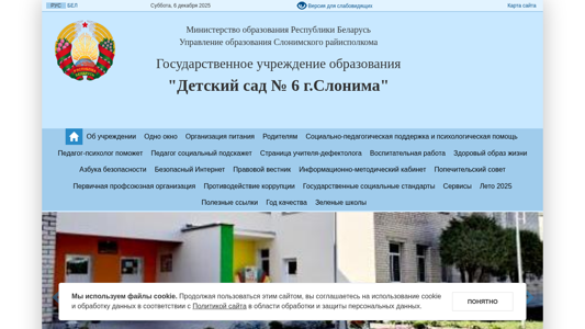 | AI-анализ | This online resource is the official website of the "Детский сад № 6 г.Слонима" (Children's kindergarten No. 6 in the city of Sloнима, Belarus). The site provides information about the kindergarten, its mission, functions, and schedule. Visitors can learn about the management team, contact information, and upcoming events. The website also includes sections on the kindergarten's policies on personal data protection and employment opportunities. Additionally, the site offers resources for parents, such as recommended menus, educational materials, and forms for various administrative procedures. Users can navigate the site using a map of the region and access a hotline for direct communication with the kindergarten. The site is operated by the Education Department of the Slonim District Executive Committee and is licensed for educational activities in Belarus. |