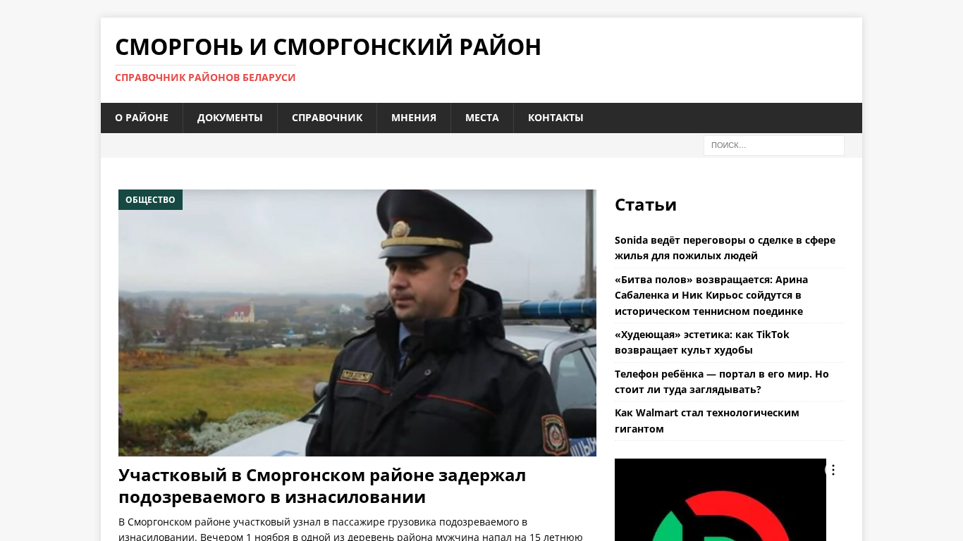 | AI-анализ | The web project "Сморгонь и Сморгонский район | Справочник районов Беларуси" (smorgon.rajon.by) is a reference guide for Smorgoń and Smorgoński region in Belarus. The website provides information on the region, including documents, contacts, and various other data. The title and description of the site indicate it is a reference book for the regions of Belarus. Keywords associated with the site include 'мтс', 'районе', 'сморгонский', 'район', 'справочник', 'месяц', and 'контакты', among others. The site contains articles on local news, including reports of a crime involving a suspect in a sexual assault case and the discovery of human remains and a gun at a local organization. Additionally, the site features articles on various |