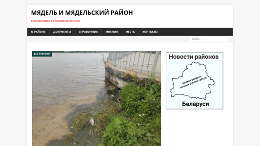 | AI-анализ | This website is a reference guide for Miazel and Miazelsky district in Belarus. The title is "Miazel and Miazelsky district | Reference book of regions of Belarus" and the description is simply "Reference book of regions of Belarus". The top keywords are 'мядель', 'мядельский', 'район', 'справочник', 'районов', 'контакты', and 'беларуси'. The website contains information on the region including documents, opinions, places, and contacts. There is a report of concern about the death of carp fish in Lake Miazel, with numerous dead fish being found in the reeds and open areas. A regional meeting of youth leaders in the education sector took place, and there are sections about safety measures to prevent accidents on water bodies, with over 1,700 emergency services personnel ensuring |