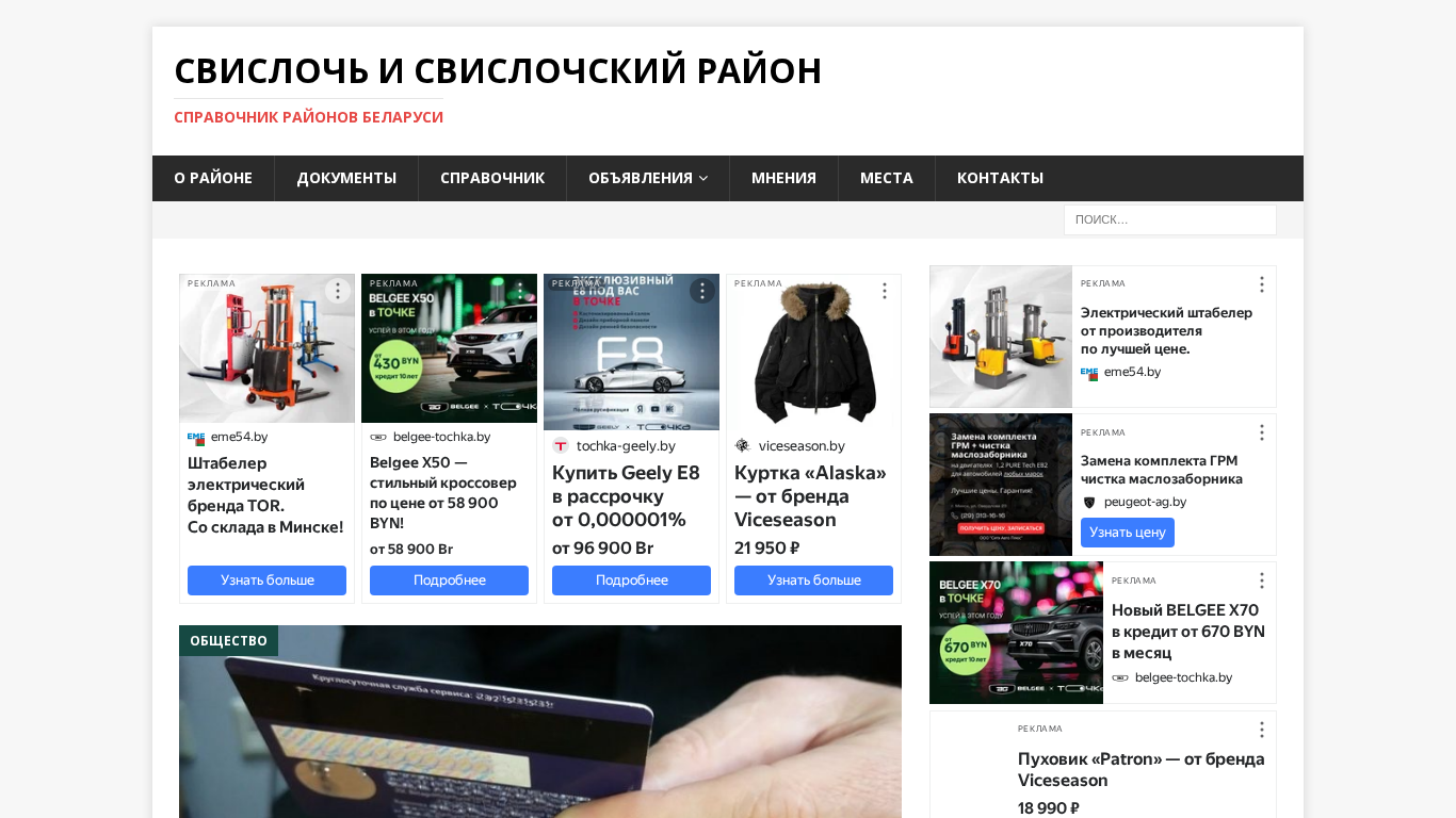 | AI-анализ | The web project "Свислочь и Свислочский район | Справочник районов Беларуси" (svisloch.rajon.by) is a reference guide for Svisloch and Svislochsky district in Belarus. The website offers sections on the region, documents, a directory, and announcements. Users can add, manage, and view opinions and locations, as well as contacts. A news article reports on phone scammers who convinced a resident of Svisloch to take out a loan of nearly Br30,000. Another article details fraud in the automobile insurance sector, which was prevented by the local police. A traffic accident resulted in the death of a motorcyclist in the village of Kuklichy. The site also features articles on real estate negotiations for the elderly, the return of the "Battle of the Sexes |
