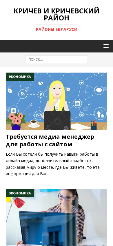 | AI-анализ | The web project "Krichev and Krichevsky district | Regions of Belarus" (<https://krichev.rajon.by>) is a regional informational directory for Krichev and Krichevsky district in Belarus. The website offers various sections including "About the region," "Documents," "Spravochnik" (Directory), "Announcements," "Manage," "Opinions," "Places," and "Contacts." The site provides information on economic opportunities, job listings for content managers and media managers, as well as casting calls for photo models for tourist advertising. The site also features articles on local culture and news, press releases from MTS, and information on various promotional offers from MTS for internet, television, and mobile services. The "Contacts" section allows users to search for contact information for various entities within |