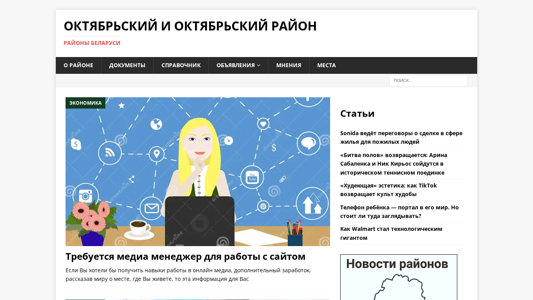| AI-анализ | The portal oktjabrskij.rajon.by is a regional information hub dedicated to Oktjabrskij and Oktjabrskij Districts in Belarus. It features a menu for navigating the site, including sections for documents, a directory, announcements, and a place to add and manage listings. The site also offers content for various topics such as economy, culture, and technology. It is currently seeking a media manager and a content manager for the site, as well as photo models for advertising local tourist attractions. The site also includes articles on various subjects, such as housing negotiations for the elderly and the return of the "Battle of the Sexes" tennis match between Arina Sabalenka and Nick Kyrios. The site also features press releases from MTS, including information about their expansion of NB-IoT networks and discounted home internet and TV services. |