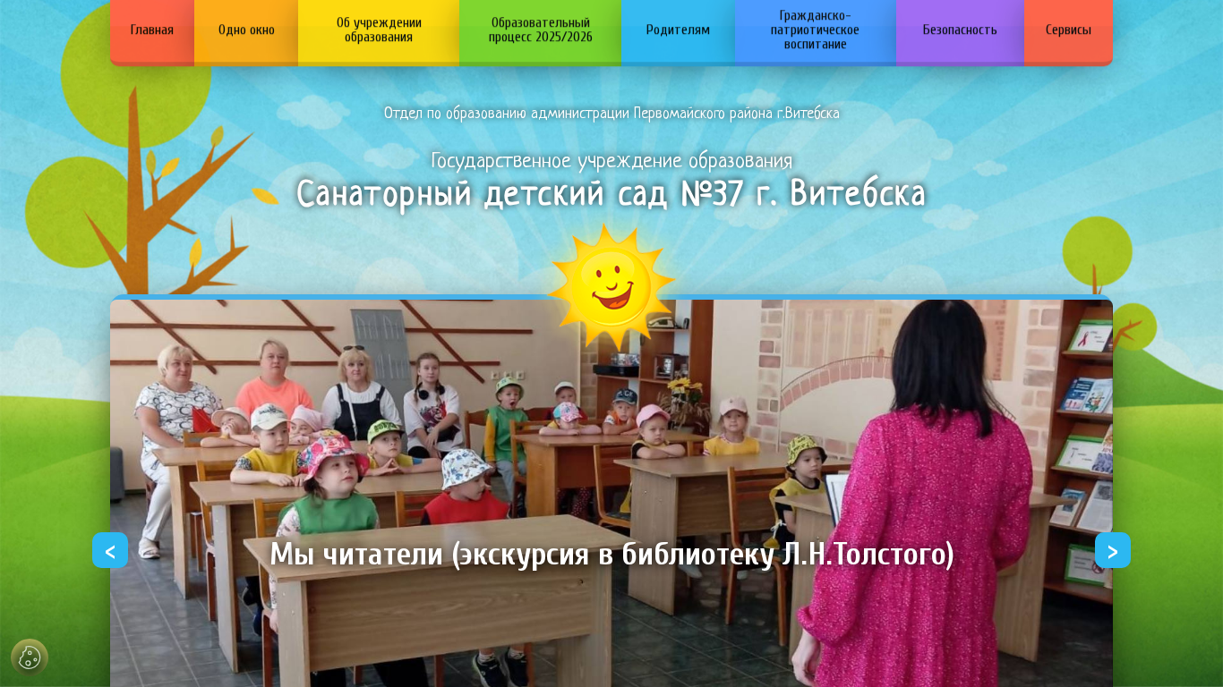 The website is dedicated to Sanatornyy Detskiy Sad №37 (Sanatorium Children's Garden №37) in the city of Vitebsk, Belarus. The title and description of the website indicate it is a state educational institution offering childcare services. The top words suggest the website provides information about the rules, contacts, and schedule of the institution, as well as its history, location, and various services, such as social support, nutrition, and educational programs. The website likely also includes forms and applications for enrollment and various administrative procedures. The domain name includes the number 37 and the phrase "pervroo-vitebsk," which may refer to the district or area of Vitebsk where the institution is located.