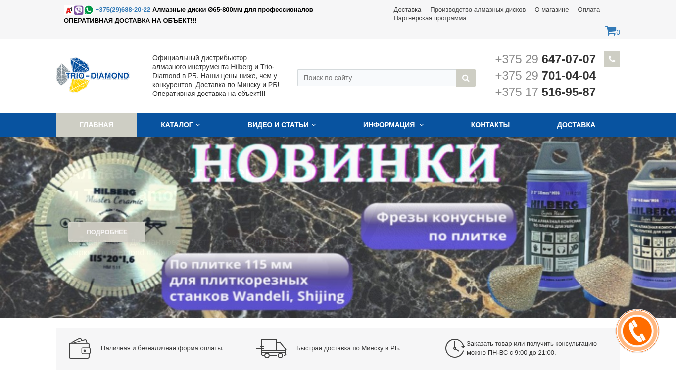 | SEO-описание | Алмазные диски. Коронки алмазные. Алмазные Черепашки. Диски по бетону. Пильные диски. Пылеудалители. Купить в Минске. Для болгарки. Для резки. Алмазный инструмент Трио Диамант Hilberg. Первый поставщик алмазного инструмента Trio-Diamond и Hilberg в РБ. Звоните:☎ +375(29)750-01-00 ☎ +375(29)165-01-00 |