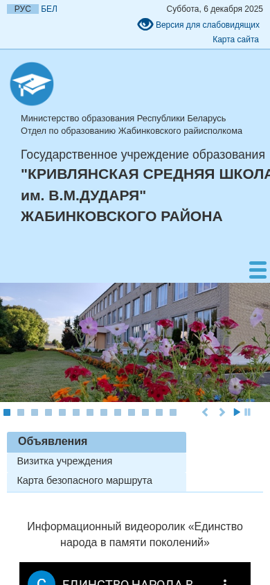 | AI-анализ | The web project "Кривлянская средняя школа" (Krivlyany Middle School) is a website of a secondary school located in the Zhabinka region of Belarus. The website provides information about the school, including its leadership team, administrative procedures, educational programs, and various initiatives. Keywords associated with the website include "school," "education," "Belarus," "republic," "safety," and "children." The website is managed by the Ministry of Education of the Republic of Belarus and the Zhabinka district executive committee, and offers features such as an electronic application system, telephones for direct contact, and a disability assistance hotline. The website also provides information on various educational programs, including agricultural classes, professional training, and a school for active citizenship. The school year schedule, class schedules, and information on student organizations and extracurric |