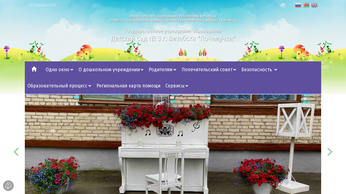 This online resource is the official website for Kindergarten No. 3 of the city of Vitsebsk, Belarus, under the name "Почемучки" (Why-nots). The site is managed by the Ministry of Education of the Republic of Belarus, the Administration of the First of May District of Vitsebsk City, and the State Educational Institution Kindergarten No. 3 of the city of Vitsebsk "Почемучки". The website provides information about the kindergarten's schedule, admission process, administrative procedures, contact details, and various services such as social-pedagogical support and psychological assistance. Additionally, it includes interactive games and maps for parents and children, as well as information about the kindergarten's history, achievements, and regulatory documents. The site is organized into several sections, including "Menu", "Administrative Procedures