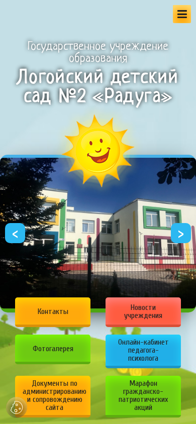 | AI-анализ | The web project "Логойский детский сад №2 «Радуга»" is a website for a kindergarten located in Belarus. The main sections of the site include "About Us," "Administration," "Pedagogical Staff," "History and Traditions," "Documents," "Admission," "Photo Gallery," "News," "Legal Documents," "Tasks and Functions," "Interactive Map," "Union Activities," "Vacancies," "One Window," "Reception Hours," "Regulations," "Administrative Procedures," "Forms," "Electronic Application," "Higher Authorities," "Contact Information," and "Rating Portal." The site offers information on the kindergarten's administration, pedagogical staff, history, documents, admission process, photo gallery, news, legal documents, tasks and functions |
