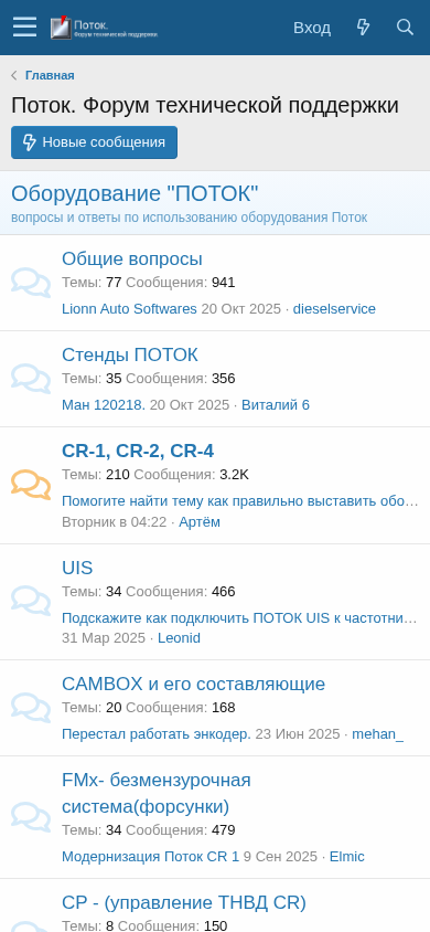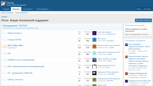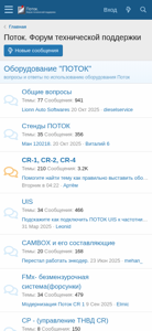 The website is a forum named "Поток. Форум технической поддержки" (Potok Forum). The description of the website is "Potok Forum". The title of the website includes the words "техническая поддержка" (technical support). The keywords for the website are not provided, but based on the top words, it seems that the forum primarily deals with "сообщения" (messages) and "темы" (topics) related to "оборудование" (equipment) named "Поток". The website contains various sub-forums, such as "Подфорумы Подключение частотных преобразователей DRV" and "Модернизация Поток CR 1", suggesting that the forum caters to discussions and support for the use, testing, and modernization of "