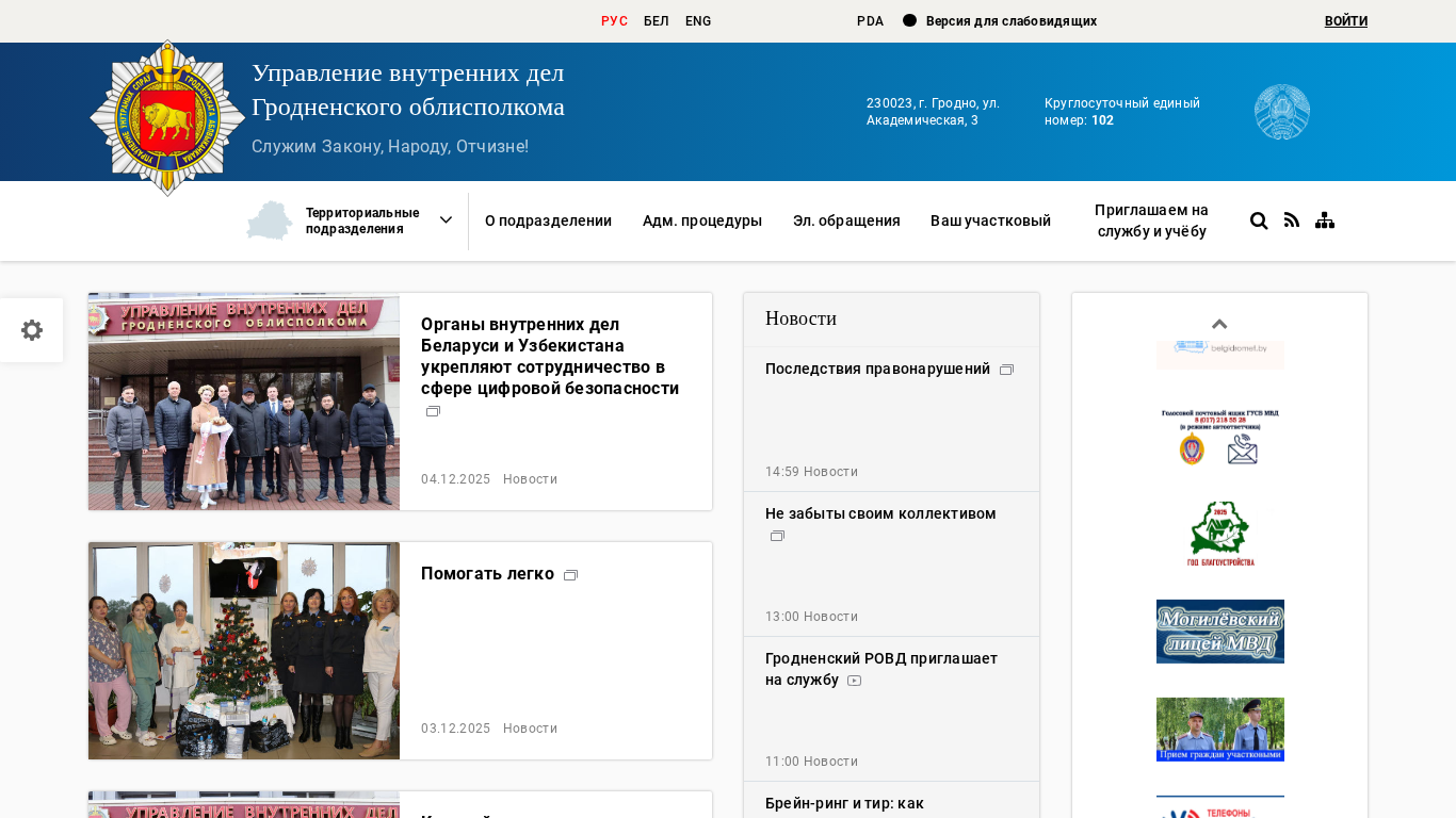 | Адрес | Управление внутренних дел Гродненского облисполкома, Служим Закону, Народу, Отчизне!, 230023, г. Гродно, ул. Академическая, 3 |