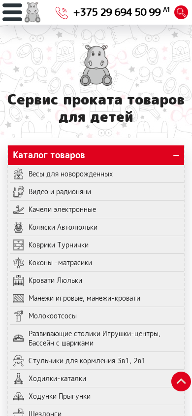 | AI-анализ | The website is a children's rental service titled "ХИППО С нами родительство в радость!" (Hippo With Us Parenting in Joy!). It is located in Minsk, Belarus, at ul. Russiaнова 11, 2nd floor, office 49. The service accepts requests from Monday to Sunday, from 9:00 to 21:00. The contact number is +375 29 694 50 99, A1. The catalog includes various children's items, such as scales for newborns, video and radio babysitters, electronic swings, strollers, playpens, bottle warmers, and rocking chairs. Specific brands mentioned include Reer, Maman, Laica, Belkin, Alecto, Philips, 4Moms, Be |