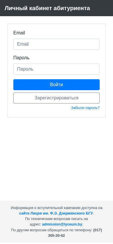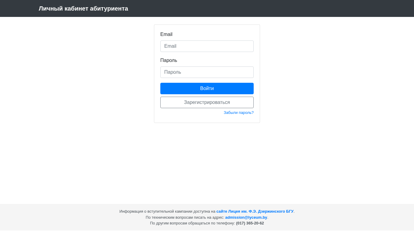 | AI-анализ | --- This online resource is titled "Кабинет абитуриента" (Cabinet of an Applicant) and belongs to the Belarusian BGU Lyceum. It provides a personal cabinet for applicants, where they can log in using their email and password. The website requires JavaScript to function. Other features include the option to register, retrieve a lost password, and access information about admission campaigns. For technical inquiries, contact admission@lyceum.by. For other inquiries, call (017) 365-20-62. The domain is admission.lyceum.by. |