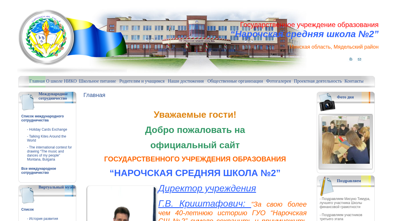 | AI-анализ | This online resource is the official website of Narochskaia Sredniaia Shkola No.2, a state educational institution located in the Miaдельskyi District of the Minskaya Oblast in Belarus. The website provides information about the school, its mission, rules, methods of teaching, resources, and various activities. It includes sections on methodological work, work with young specialists, historical background, informatization, resource centers, library, school anniversary, safety, family, technology, intellectual property, and various events. The website also features sections on military-patriotic education, genocide remembrance, financial literacy, spiritual and moral education, and school cafeteria for parents and students. The website is available in Belarusian and Russian languages. |