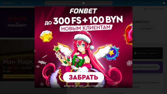 | Адрес | Парковка, Развлечения, Тихая фоновая музыка, Показать ещё, Часто просматривают, Мон Марк, 2.9 км • ул. Суворова, Кафе, Акция «Имениннику десерт в подарок», Арена пицца, 3 |