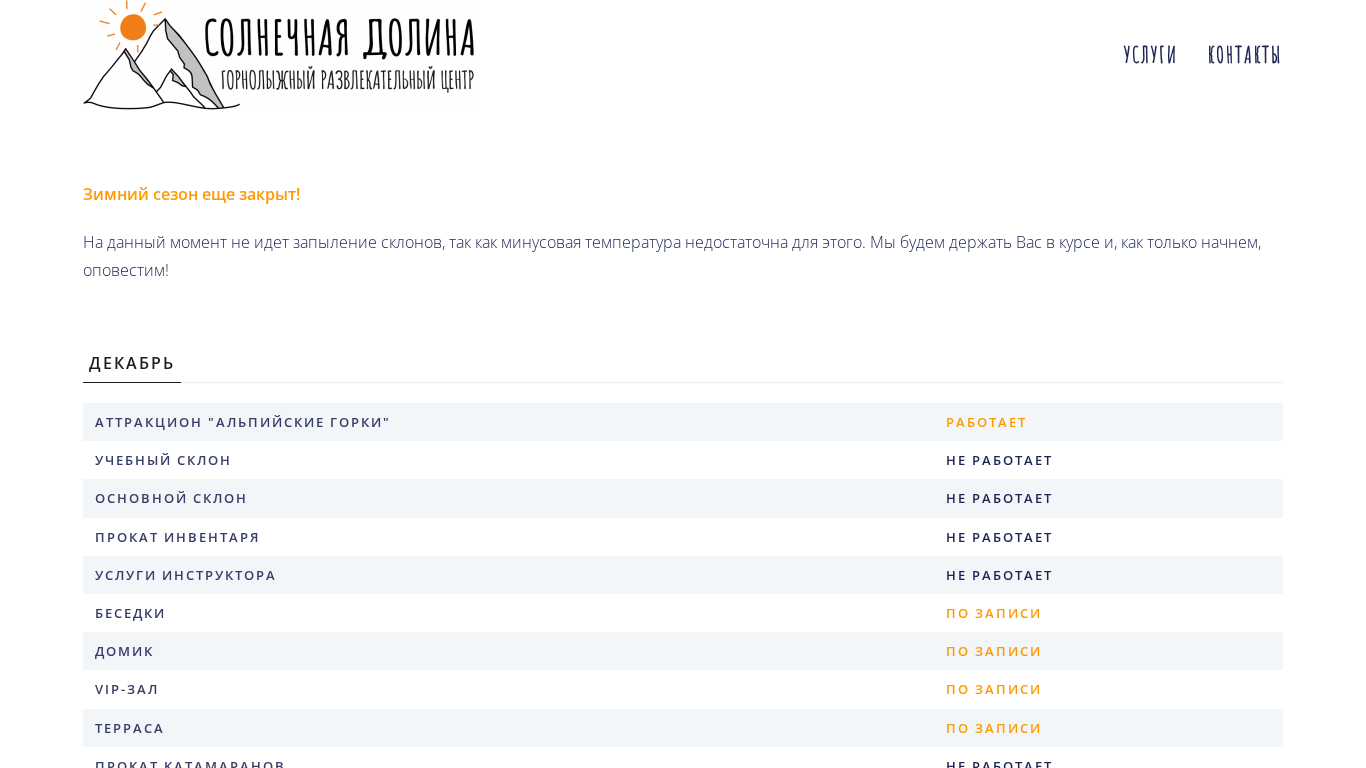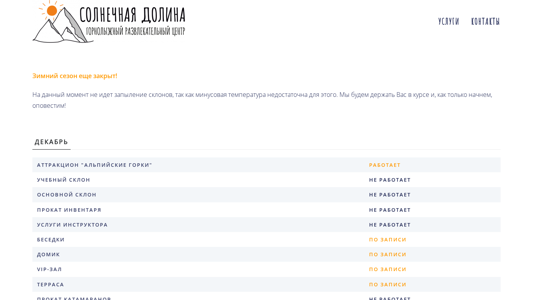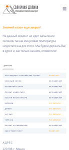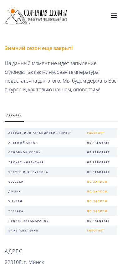 | AI-анализ | This website is for the Sunny Valley Ski Resort in Minsk, Belarus. It offers various services and attractions such as "Alpine hills," rental cabins, VIP rooms, terraces, and catamaran rides, as well as a cafe and a gallery. The winter season is currently closed and there is insufficient temperature for snowmaking. Contacts are provided for attractions, rentals, and the cafe. The resort is located at 220108, Khorzhevskogo Street, 45/1 in Minsk. The operating hours are Monday through Sunday, 11:00 AM to 9:00 PM. The email address is [soll-do@yandex.by](mailto:soll-do@yandex.by). Banking information is also available. |