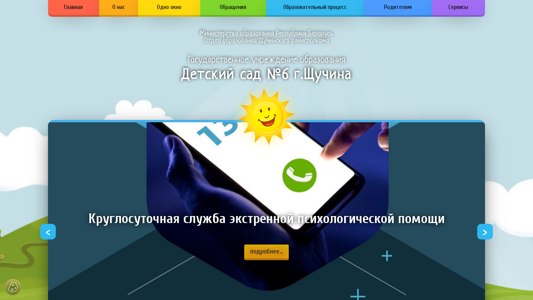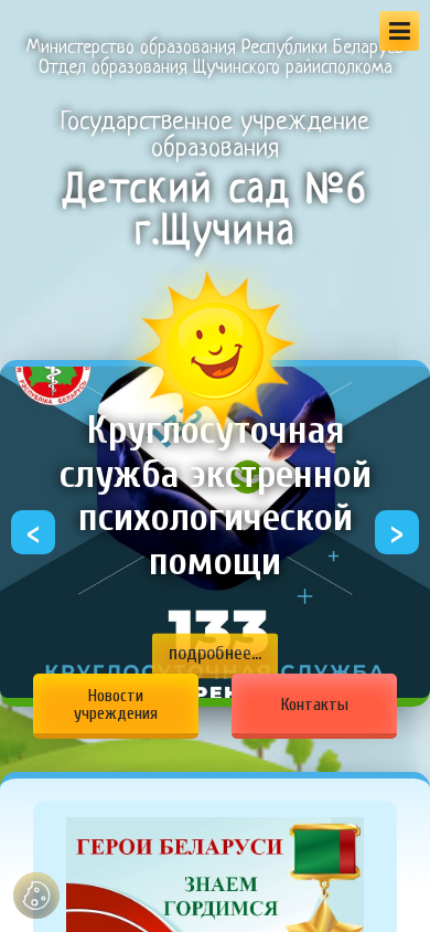 | AI-анализ | This online resource is a website for Kindergarten No. 6 in the city of Schuchin, Belarus. The title of the website is "Детский сад №6 г.Щучина" (Children's Kindergarten No. 6 in Schuchin). The description includes information about the educational institution, its history, traditions, achievements, goals, leadership, and structure. The website also provides contact details, a protection of personal data statement, and information about the organizational structure of the Kindergarten. The main topics covered on the website are education, administration, and policies. The keywords associated with the website include "education," "institution," "2025," "detailed," "news," "preschool," "November," "contacts," "Belarus," "admission," "psychological support," and "kindergarten." The |