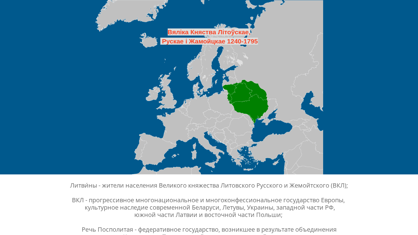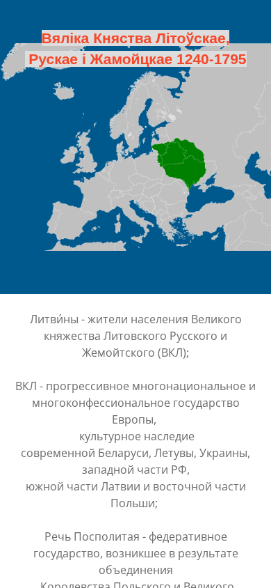 | AI-анализ | --- The website Litvin.by is dedicated to the Grand Duchy of Lithuania (Vяліка Княства Літоўскае, Рускае і Жамойцкае), a multinational and multiconfessional European state that existed from approximately 1240 to 1795. The Grand Duchy of Lithuania encompassed territories from the Baltic to the Black Sea. Notable achievements of this period include its longevity, as it existed for over 550 years; its territorial expansiveness, making it the largest state in Europe at the time; and the adoption of the first constitution in Europe on May 3, 1791. The website provides information on the history and culture of the Lithuanians (Литвины), who were the inhabitants of the Grand Duchy |