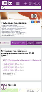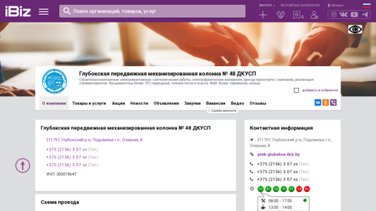| Название / Заголовок | Глубокская передвижная механизированная колонна № 48 ДКУСП - Строительно-монтажные, электромонтажные, сантехнические работы, электрофизические измерения, аренда транспорта с экипажем, реализация стройматериалов. Фундаментные блоки. ПГС природный, сеяный песок II класса. ЖБИ: блоки, перемычки, кольца.. 211797, , Подсвилье г.п., Озерная, 8 |