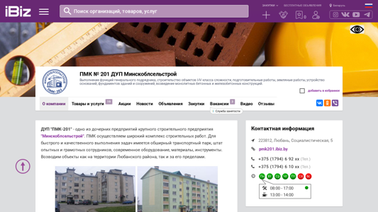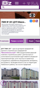 | AI-анализ | <!--- end fragment ---> The website is for ПМК № 201 ДУП Минскоблсельстрой, a construction company based in Любань, Belarus, specializing in the execution of general contractor functions, construction of objects of classes I-IV complexity, preparatory works, land works, foundation and building base installation, and the construction of monolithic concrete and reinforced concrete structures. The company's address is provided as Социалистическая, 5, 223812. The website includes information on the company's services, contact details, and a list of its main activities. The domain is pmk201.ibiz.by. |