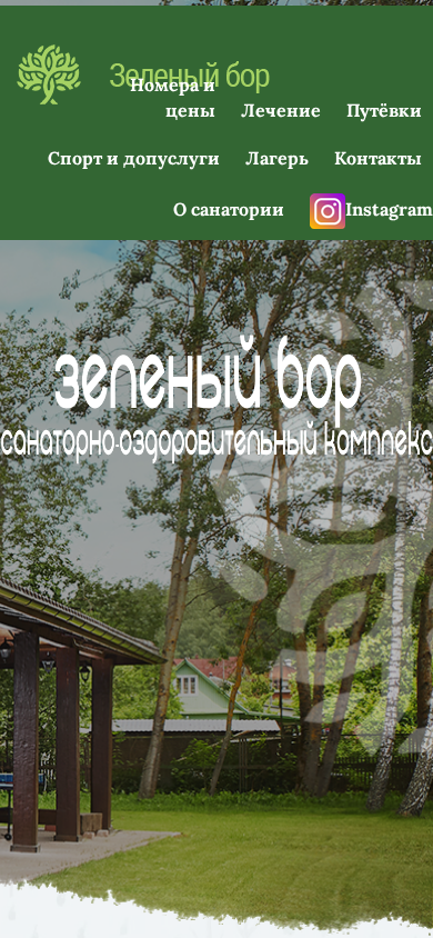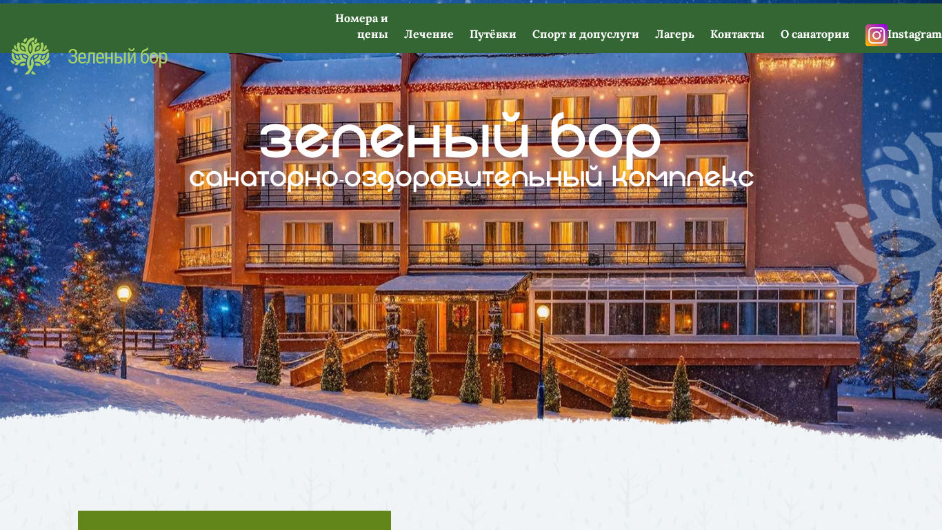 This website is for the health resort "Zeleny Bor," a structural division of Minsk-Arena with year-round accommodation, located in a scenic forest area 12 km from Minsk amidst coniferous and deciduous trees and 5 km from the Zaslavskoye Reservoir. The resort offers a comfortable health spa equipped with modern diagnostic and treatment equipment for various ailments.