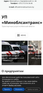 | AI-анализ | --- The web project "Миноблсантранс" (Minoblsantrans.by) is a transport services company based in the Minsk region, Belarus. The website provides information about the company's administration, services, and contacts. Services offered include transportation services, repair and maintenance of vehicles, vehicle storage, sauna, and car wash. The website also features a news section, a policy on personal data processing, and a vacancy page. Users can find information about the company's structure, its fight against corruption, and its approach to labor safety. The website is available in Belarusian and Russian languages. |