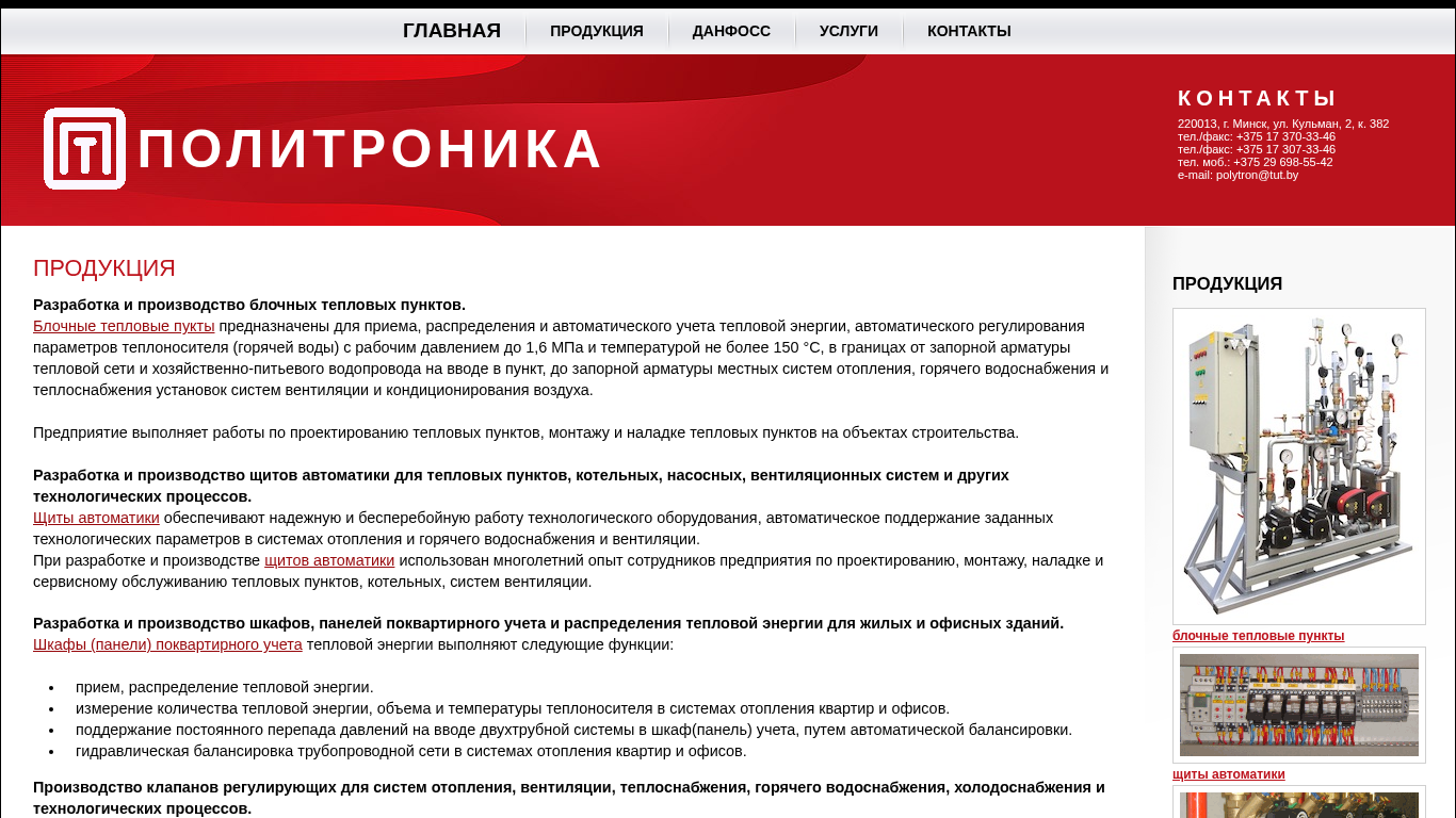 | AI-анализ | --- This website, titled "Предприятие Политроника," focuses on the production, supply, design, installation, and servicing of energy-saving equipment for residential, public, and industrial buildings. Key products include Danfoss equipment, such as temperature control panels and automatic controls. The company offers Danfoss block heating systems, automated control systems for boilers, pumps, and ventilation systems, and energy meters for residential and office buildings. Additionally, they provide design and manufacturing services for custom heating and energy management systems. |