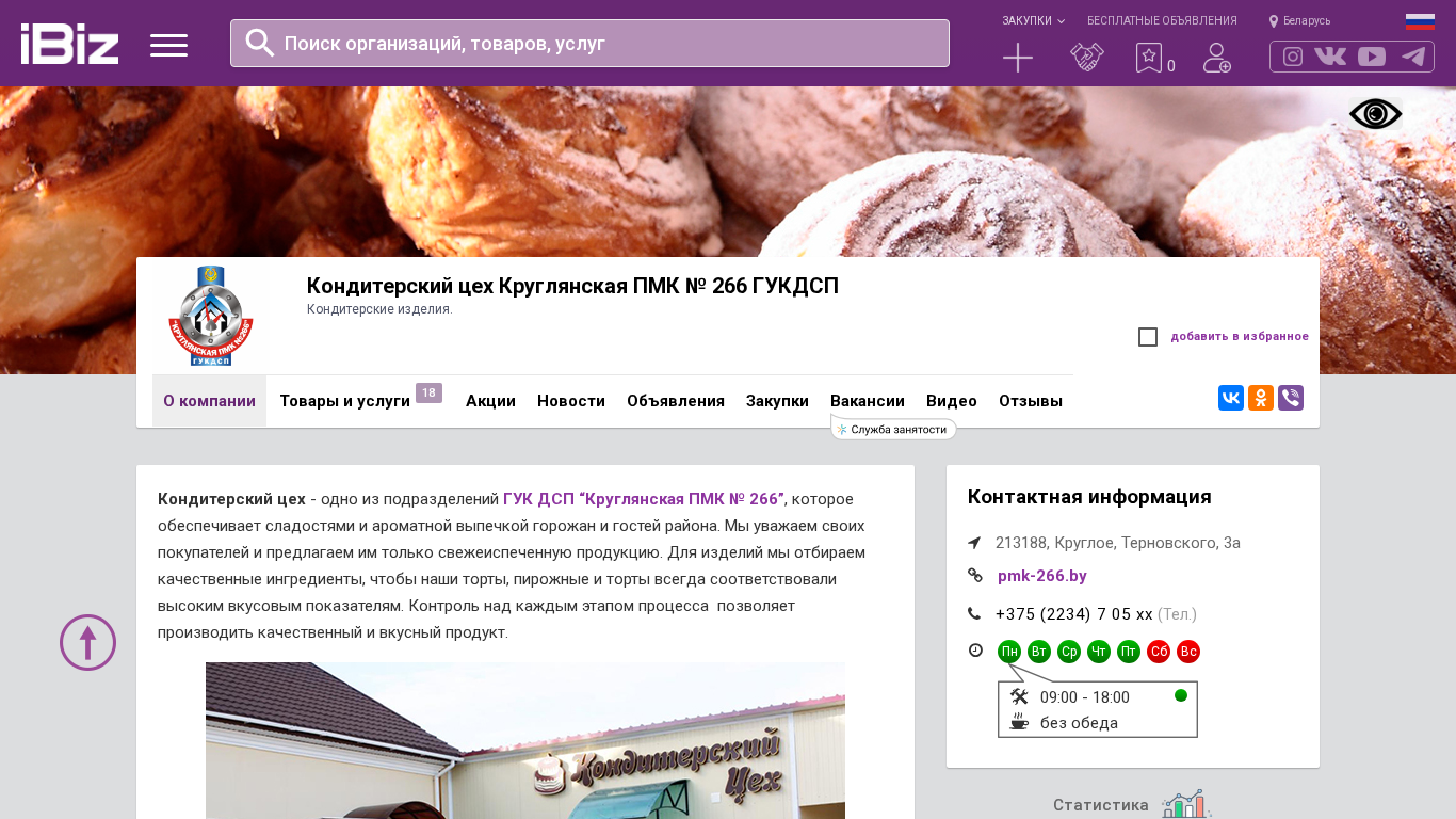 | Название / Заголовок | Кондитерский цех Круглянская ПМК № 266 ГУКДСП - Кондитерские изделия. . 213188, Круглое, , Терновского, 3а |