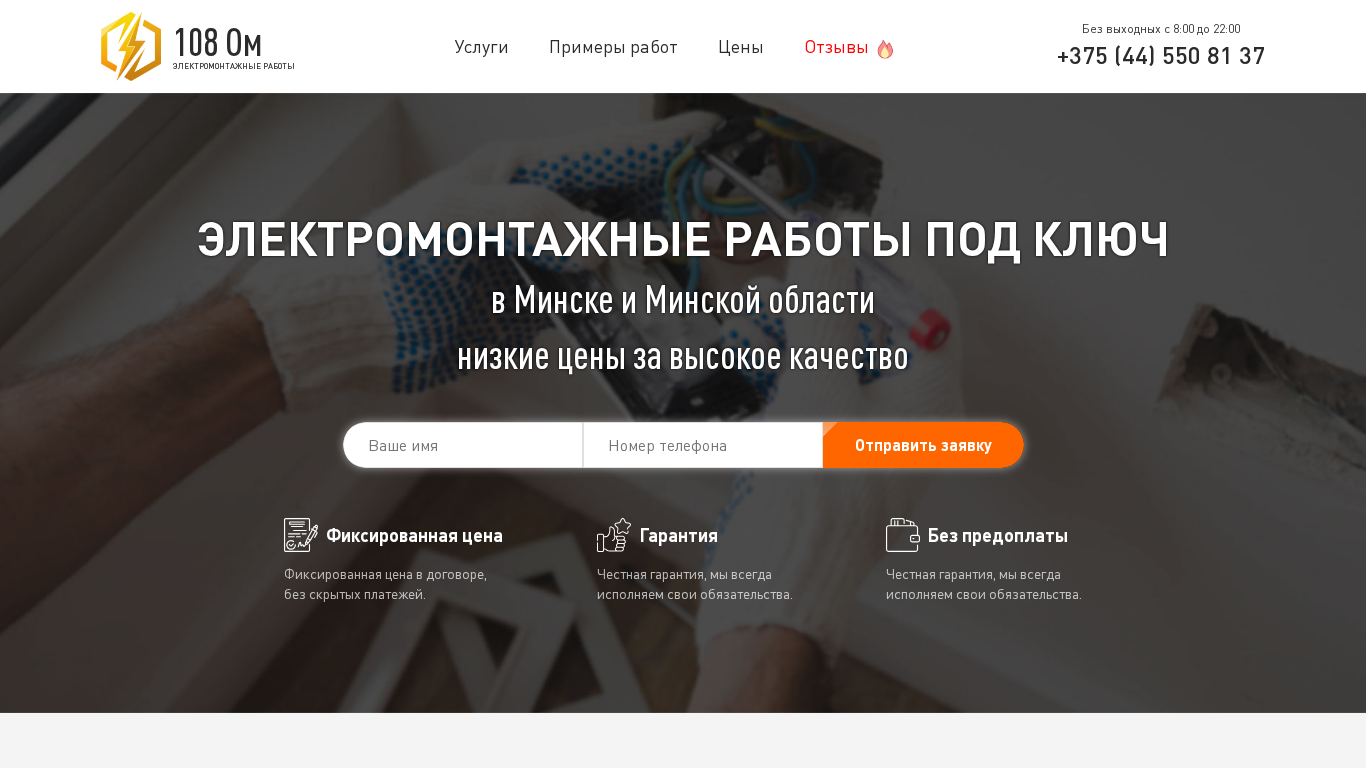 | SEO-описание | Мы знаем об электромонтаже всё. Наш стаж работы более 15 лет. Окажем любую консультацию в сфере электромонтажа. Работаем качественно, чисто, быстро. Внимательно и с чувством долга относимся к пожеланиям заказчика. Все написанное докажем на деле. Звоните в любое время +375 (44) 550 81 37 |