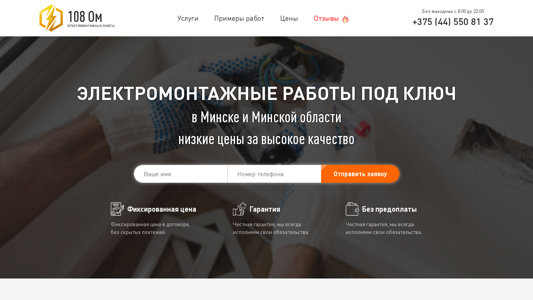 | AI-анализ | The website 108om.by is a service company based in Minsk and Minsk region offering electrical mounting works under contract. With over 15 years of experience, they provide consultations in the field of electrical mounting and assure quality, cleanliness, and promptness. They attend to customer requests with care and honesty, as shown in their testimonials. The site includes information on their services, examples of completed projects, prices, and customer reviews. They operate around the clock, and their contact number is +375 (44) 550 81 37. The site also features their social media presence. Their services include electrical mounting in apartments starting at 40 BYN/m2, in cottages at the same price, hidden wiring installation in wooden houses for 40 BYN/m2, and electrical mounting in industrial facilities |