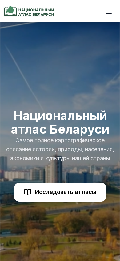 | AI-анализ | --- This online resource is the National Atlas of Belarus, a web application for studying the geography, history, and culture of Belarus. It provides detailed maps, statistics, and historical data. The title of the website is "Национальный атлас Беларуси" (National Atlas of Belarus). The description tag mentions that it is a Belarusian atlas with maps, geography, history, and national information. The top keywords are "атлас" (atlas), "беларусь" (Belarus), "карты" (maps), "география" (geography), "история" (history), and "национальный" (national). The National Atlas of Belarus is the most comprehensive cartographic description of the history, nature, population, economy, and culture of the country. It |