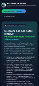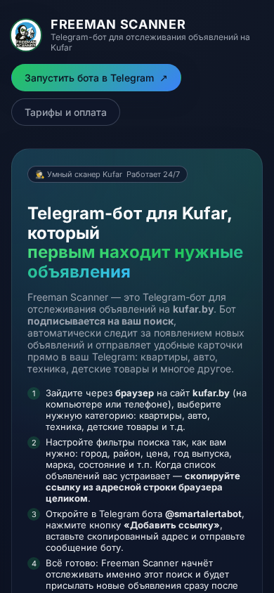 | SEO-описание | Freeman Scanner — Telegram-бот для отслеживания объявлений на Kufar. Бот подписывается на ваш поиск на kufar.by, автоматически находит новые объявления (квартиры, авто, техника и другие товары) и сразу присылает их в ваш Telegram. |