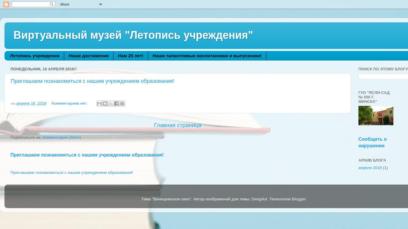 The portal is a virtual museum named "Letoпись учреждения" (Chronicle of the Institution), showcasing the history and achievements of a Belarusian educational institution, Jasly-sad № 556 in Minsk. The website invites visitors to learn about the institution, its talented students and graduates, and its 25-year history. The main page includes a call to visit the institution and offers a search function for the blog. The blog features a post from April 16, 2018, inviting visitors to get acquainted with the institution, and includes links to share the post on various social media platforms. The website is hosted on Blogspot and includes a theme titled "Венецианское окно" (Venetian Window) with images by Deejpilot. The domain is registered as guo55