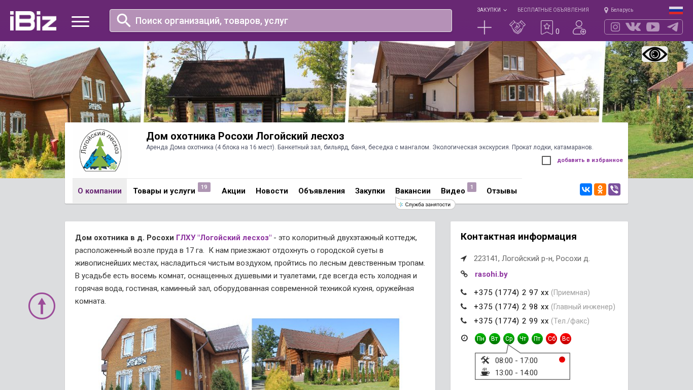 | Название / Заголовок | Дом охотника Росохи Логойский лесхоз - Аренда Дома охотника (4 блока на 16 мест). Банкетный зал, бильярд, баня, беседка с мангалом. Экологическая экскурсия. Прокат лодки, катамаранов.. 223141, , Росохи д. |