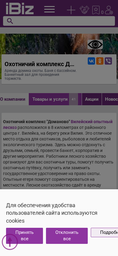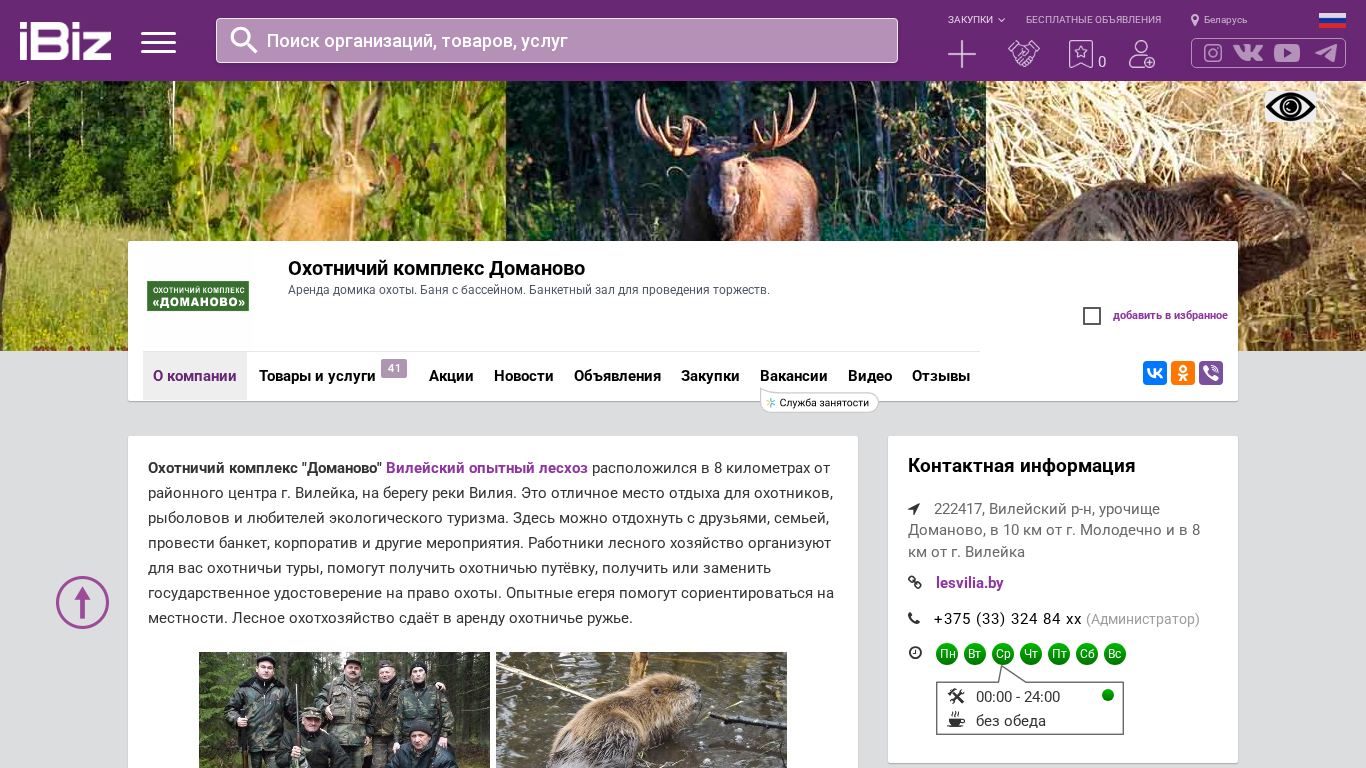 <-- This online resource is an outdoor recreation complex called "Доманово" located in the Vilensky Experimental Forest, 8 km from the town of Вилейка, and 10 km from the city of Молодечно in Belarus. The complex offers rental cabins for hunting, a banquet hall for events, and a banya (Russian sauna) with a swimming pool. The forestry company organizes hunting tours, helps obtain hunting permits and certificates, and provides experienced guides. Accommodation is available in one, two, four, and other multi-person cabins, with larger cabins suitable for hosting banquets for up to 70 people. The cabins are equipped with all necessary amenities for comfortable living. The complex also offers a billiard table, tennis court, and rents out skiis, bicycles, fishing equipment,