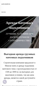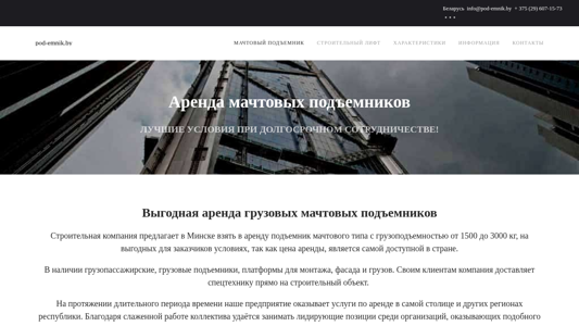 | AI-анализ | The web project "Pod-emnik.by" offers crane rental services in Minsk, Belarus, including construction cranes, facade platforms, and prices. The website keywords include "podemnik," "machtovogo," "podiemnika," "platformy," "machtovy," "stroitelny," and "aренда." The most frequently used words are "podium," "podiemnik," "mshf," "msm," "platforms," "information," and "contacts." The website provides information on the characteristics and rental rates for various types of cranes and platforms, as well as contacts for inquiries and orders. The company offers long-term rental services for a range of cranes and platforms, including those with a lifting capacity of 1500 to 3000 kg. The company's services are available |
